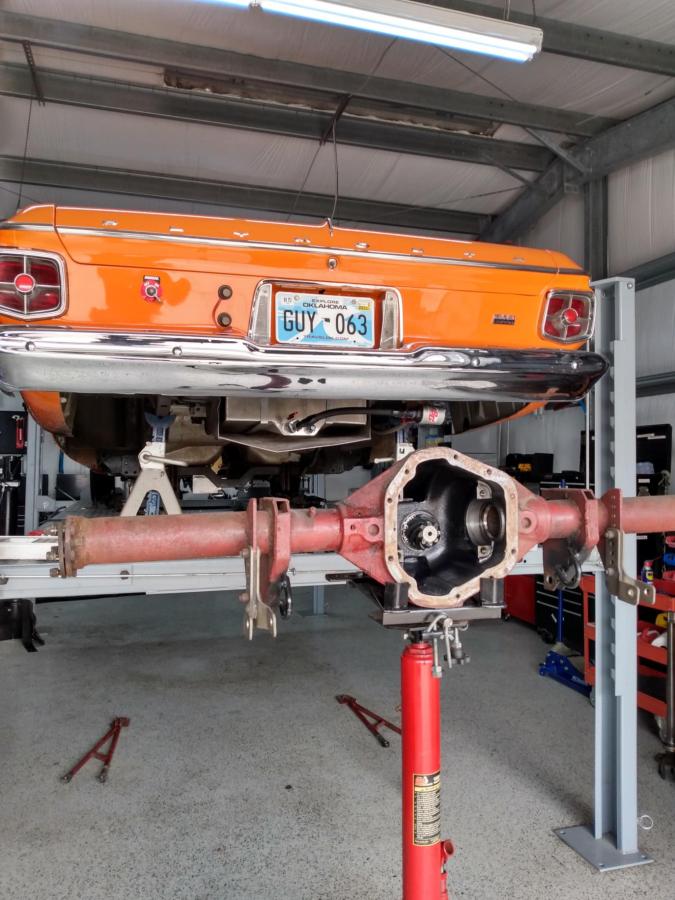 In the meantime, the car is stuck in the lift without axles. Jerry will pull some axles out of an 8.75 I have laying around so we can get the car off of the lift and the wagon on. The wagon needs and anti-roll assembly welded in.