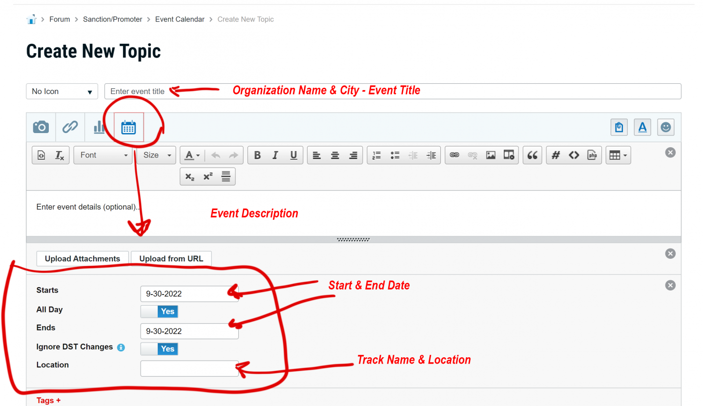 Enter the Organization Name & City - Event Title (IE: NMCA Indy - Dave Duell Classic) for the event title